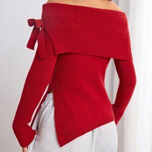 Burgundy Casual Women's Asymmetric Hem Off Shoulder Long Sleeve Sweater