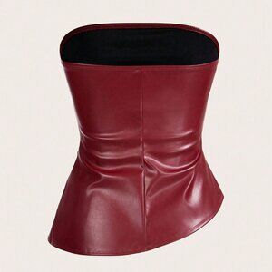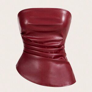 Burgundy Casual Women's Asymmetric Hem faux leather Ruched Tube Top Valentine