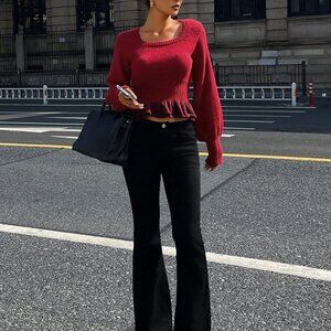 Elevate your late fall style with this burgundy casual sweater, featuring a square neck, regular fit, and long lantern sleeves with contrast color ruffle trim for a chic look.