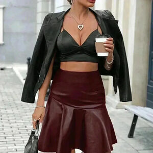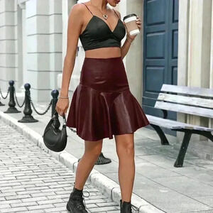 Burgundy Casual Women's Fashion Faux Leather Ruffle Hem Skirt