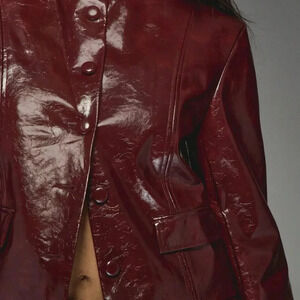 Burgundy Casual Women's Faux Leather Buttoned Round Neck Long Sleeves Jacket