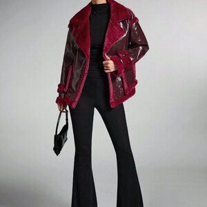 Burgundy Casual Women's Faux fur detailed Long Sleeve Faux Leather Jacket Coat