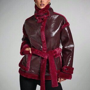 Burgundy Casual Women's Faux fur detailed Long Sleeve Faux Leather Jacket Coat