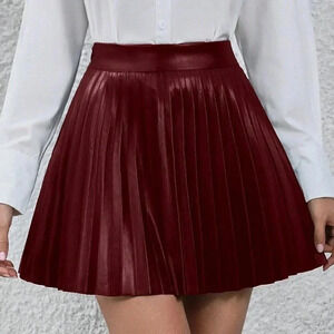 Burgundy Casual Women's High Waist Pleated Faux Leather Mini Skirt