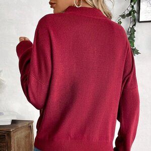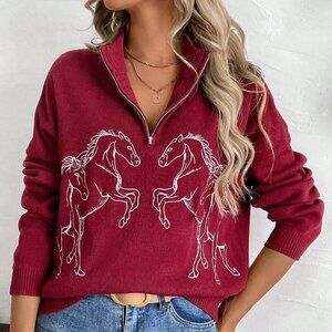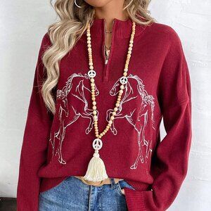 Burgundy Casual Women's Horse Print Half Zipper Dropped Shoulder sweater