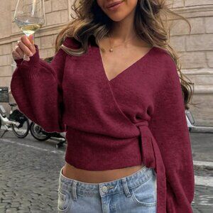 Burgundy Casual Women's Knotted Comfortable & Elegant wrap Cardigan Sweater top