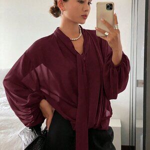 Burgundy Casual Women's Loose Fit Long Sleeve Tie Blouse