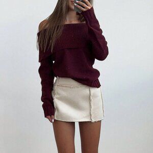 Burgundy Casual Women's Off-Shoulder Long-Sleeved Knitted Sweater