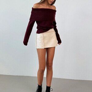 Burgundy Casual Women's Off-Shoulder Long-Sleeved Knitted Sweater