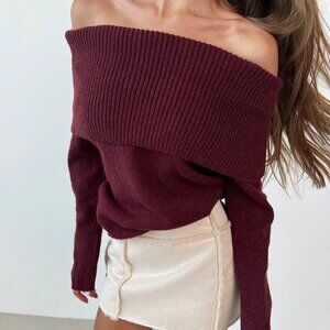 Burgundy Casual Women's Off-Shoulder Long-Sleeved Knitted Sweater