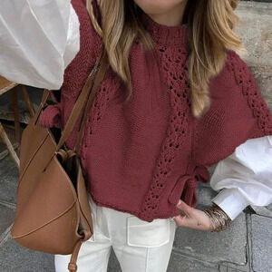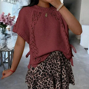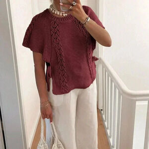 Burgundy Casual Women's Side Tie Round Neck Cap Sleeve Sweater