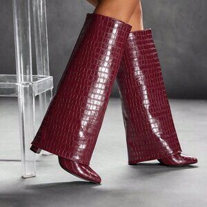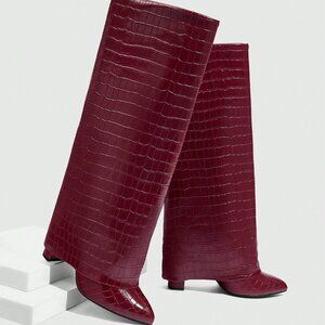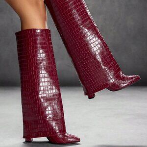get ready for the season in these Burgundy Chunky Heel Pointed Toe alligator print boots