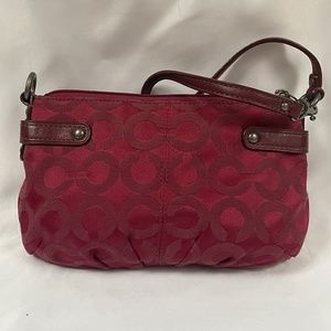 Like-new burgundy coach wristlet! This bag has a strap that can be attached to either the zipper or the other side of the bag to convert it from a wristlet to a mini bag. The bag has been gently used with no visible scuffs.