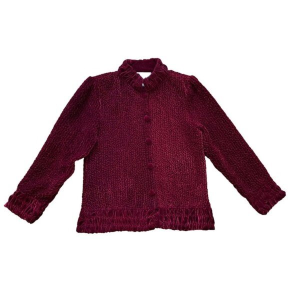 Jeune-Jeunesse deep burgundy crushed velvet button front cardigan/jacket has all-over ripple texture with ruched detailing at collar, sleeve cuffs hemline. Tag size is women's Small - see below for garment measurements. 100% polyester. Very good pre-owned condition.