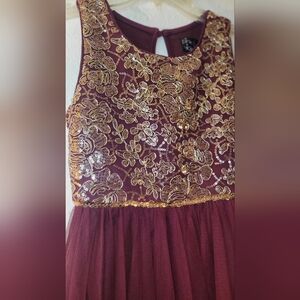 Elegant burgundy dress featuring a stunning gold sequin floral pattern. Perfect for special occasions.