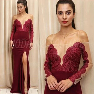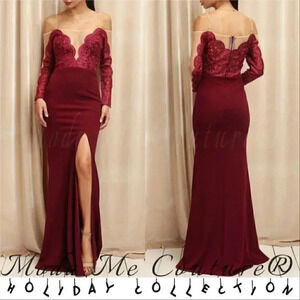 Where do I start with this elegant burgundy gown? This Dress is so chic and the fit is so MOVIE STAR! Look at that embroidery and the high slit! This dress a statement maker!