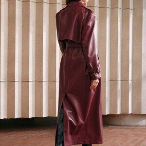 Burgundy Elegant Women's Casual faux Leather trench coat Jacket