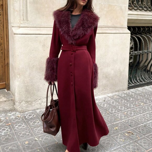 Burgundy Elegant Women's Faux Fur Collar Design Long Belted Coat