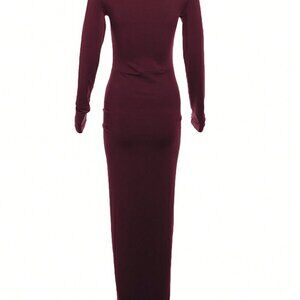 Burgundy Elegant Women's Fitted Crew Neck Long Sleeve Ruffle Hem Dress