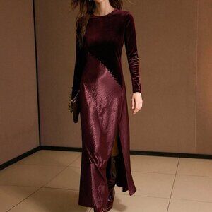 Burgundy Elegant Women's Velvet Satin Mixed Media Split Thigh Long maxi Dress
