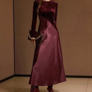 Burgundy Elegant Women's Velvet Satin Mixed Media Split Thigh Long maxi Dress