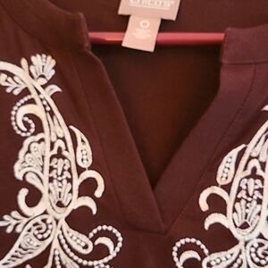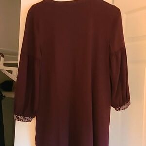Elegant burgundy dress with intricate white embroidery. Features three-quarter sleeves. Perfect for casual or semi-formal occasions. chicos size 0- comparable to a small. has pockets!!