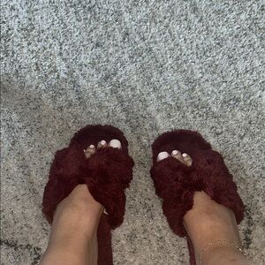 Burgundy Faux Fur slip on slide Slippers with open square toe cushioned insole