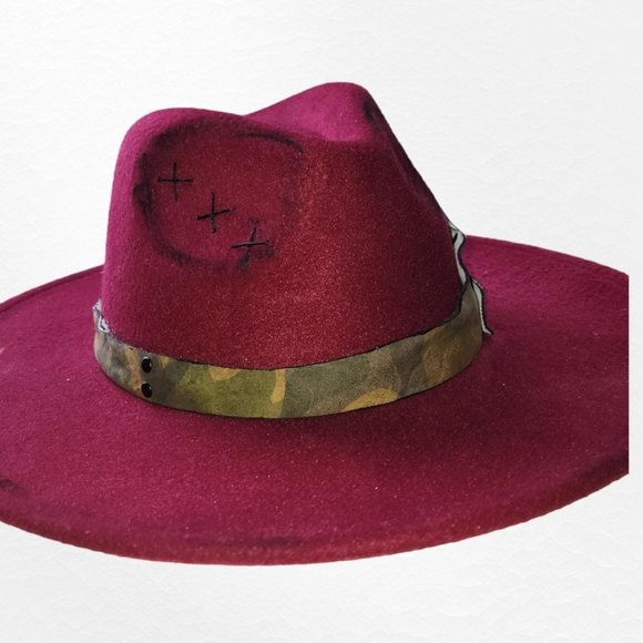 Camo accent trim on Burgundy Fedora styled Hat. New never worn. Has adjustable strap for fitting.