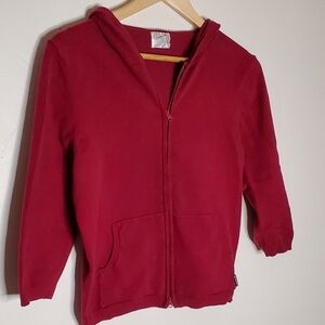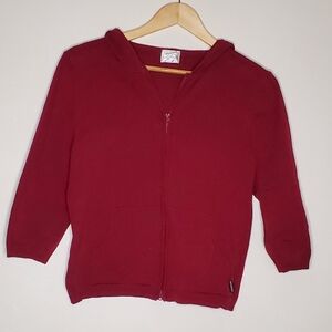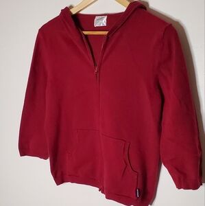 Simple style burgundy red flat basic knit sweater, in zip-up hoodie form. Sweater has 3/4 length sleeves, front sporty-style pockets and hood.
