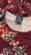 Dress is a burgundy or wine color and the floral pattern is orange, a lighter orange/peach, white, gray, and black.