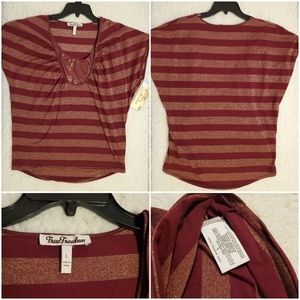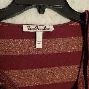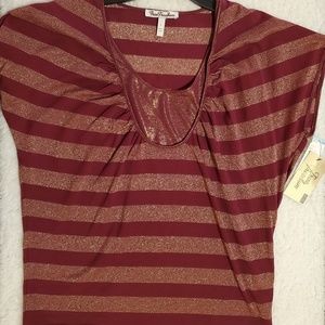This brand new burgundy and gold shimmery shirt. This short sleeve shirt can be worn for any event. It's made of 49% Cotton, 33% Polyester, 7% Nylon, 6% Metallic & 5% Spandex. The gold stripes are horizontal. This shirt is not red, there wasn't an option to choose burgundy.