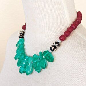 Burgundy & Green Quartz & Recycled Glass African Print Bib Necklace