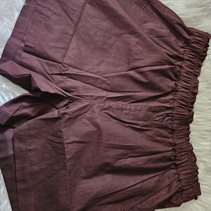 Stylish brown high-waisted shorts with an elastic waistband and front pockets.