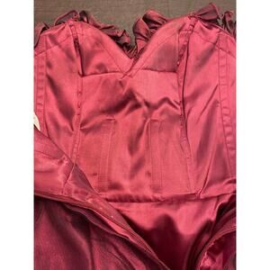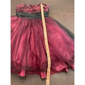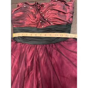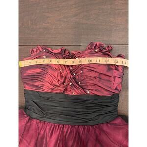 Gorgeous strapless burgundy and black formal dress featuring a sweetheart neckline, rhinestone-embellished ruched bodice, and flouncy layered tulle skirt for a twirl-ready silhouette. The bodice has delicate ruffled trim and a wide ruched waistband that cinches the waist for a flattering hourglass shape. Bodice has boning to keep structure.