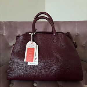 Beautiful burgundy leather bag perfect for fall! Chic bag features dual handles and a detachable strap. Bag has an inside zipper, inner clasp closure and gold feet. The sides of the bag can be expanded. Made in Italy, brand new with tags attached, genuine leather, tik tok viral!