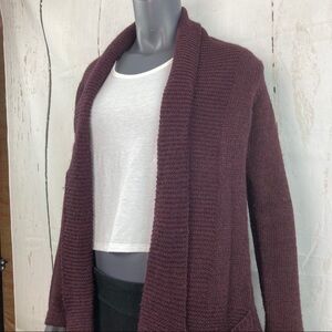 This is a gently used condition dark maroon burgundy colored knit sweater cardigan. It has really unique pockets as shown in close-ups. Open front.