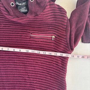 Stylish burgundy knit hoodie. Features a front zipper pocket. Perfect for casual wear.