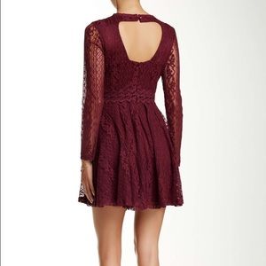 Never been worn! Beautiful lace detail and partial open back with a button closure. Perfect for fall and the holidays. Approx 33" in length.