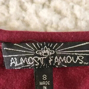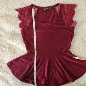 This elegant peplum top from Almost Famous in a rich burgundy color features a rounded neckline and intricate lace cap sleeves, adding a romantic touch to the design. In fabulous pre-owned condition, this top is a size small.