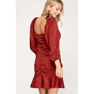 Burgundy Leopard Ruched Ruffle Mini Dress