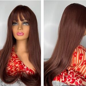 Burgundy With Bangs | Ultra Natural Look | Real Hair Feel Description: Achieve a beautifully natural look with this 22 inch long synthetic wig in a Rich Dark Burgundy Style shade. Designed to look and feel just like real hair, this wig has soft, loose waves and trendy bangs that perfectly frame the face for an effortlessly chic style.