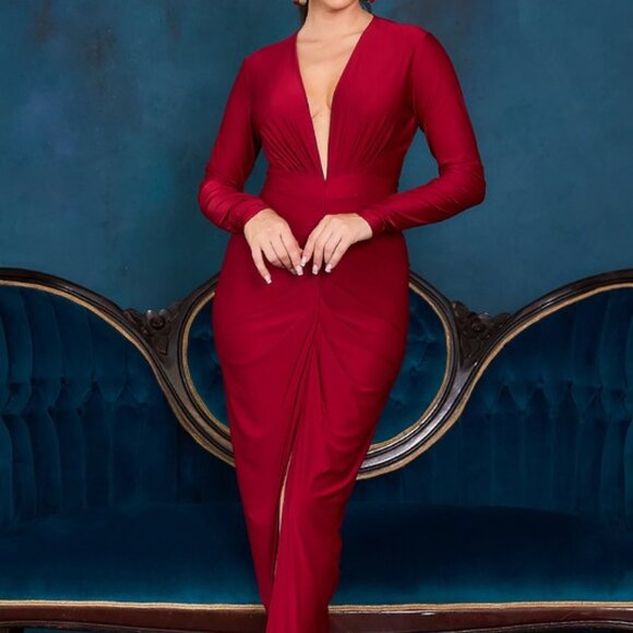 Capture playful elegance with the Burgundy Midi Dress . Its v-neck, front pleated drape detail is adorned with front slit that enhances charm, making it a perfect choice for expressing your feminine style with confidence.