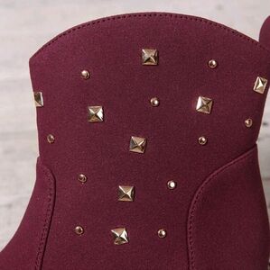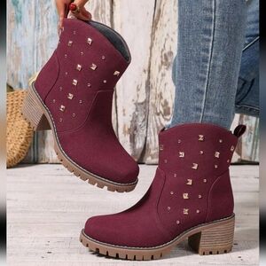 Burgundy MixedRivetAsymmetricalChunky Heel Round Toe Thick Sole Comfortable Boot