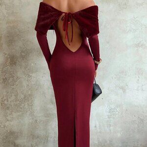 Burgundy Party Women's Luxury Faux Fur Collar Bodycon Backless Slit Dress