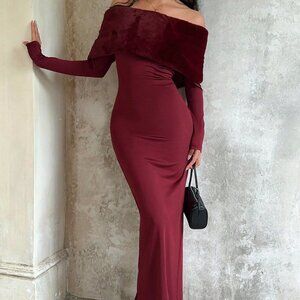 Burgundy Party Women's Luxury Faux Fur Collar Bodycon Backless Slit Dress