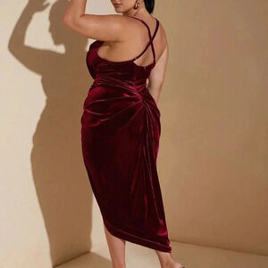 Burgundy Party Women's Plus Size Slit Maxi Velvet Spaghetti Strap Dress