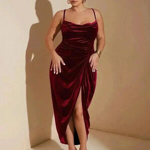 Burgundy Party Women's Plus Size Slit Maxi Velvet Spaghetti Strap Dress