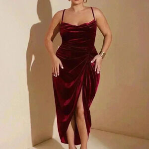Burgundy Party Women's Plus Size Slit Maxi Velvet Spaghetti Strap Dress