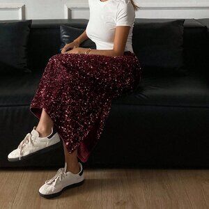 Elegant and perfect for a party, this long, burgundy skirt features a skinny fit and a stylish side slit. Its sequin embellishments add a touch of glamour, making it an perfect for Christmas celebrations.