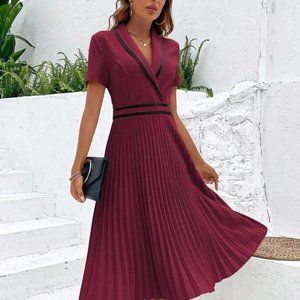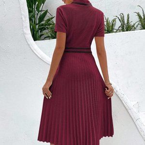 Burgundy Preppy Womens Contrast Binding Pleated Hem Dress